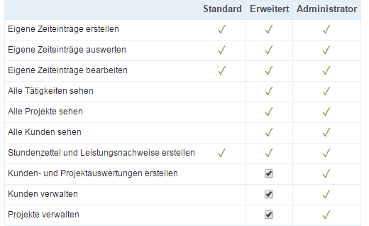 Für jeden Benutzer kann eine der drei Rollen, Mitarbeiter, Manager oder Administrator vergeben werden. Administratoren dürfen natürlich alles anlegen, ändern und weitere Teammitglieder einladen. Manager dürfen Stammdaten anlegen und verändern und Mitarbeiter haben nur das Recht Zeiten zu erfassen.