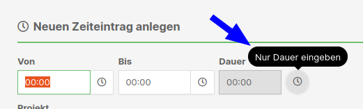 Normalerweise werden bei der Eingabe der Arbeitszeit die Uhrzeiten von-bis verwendet. Dabei wird für jedes Starten der Stoppuhr ein neuer Zeiteintrag erstellt. Es ist aber auch möglich nur die Dauer der jeweiligen Arbeitszeit zu erfassen. Dann kann die Stoppuhr bei einem Zeiteintrag fortgesetzt werden, ohne dass ein neuer Eintrag gespeichert wird.